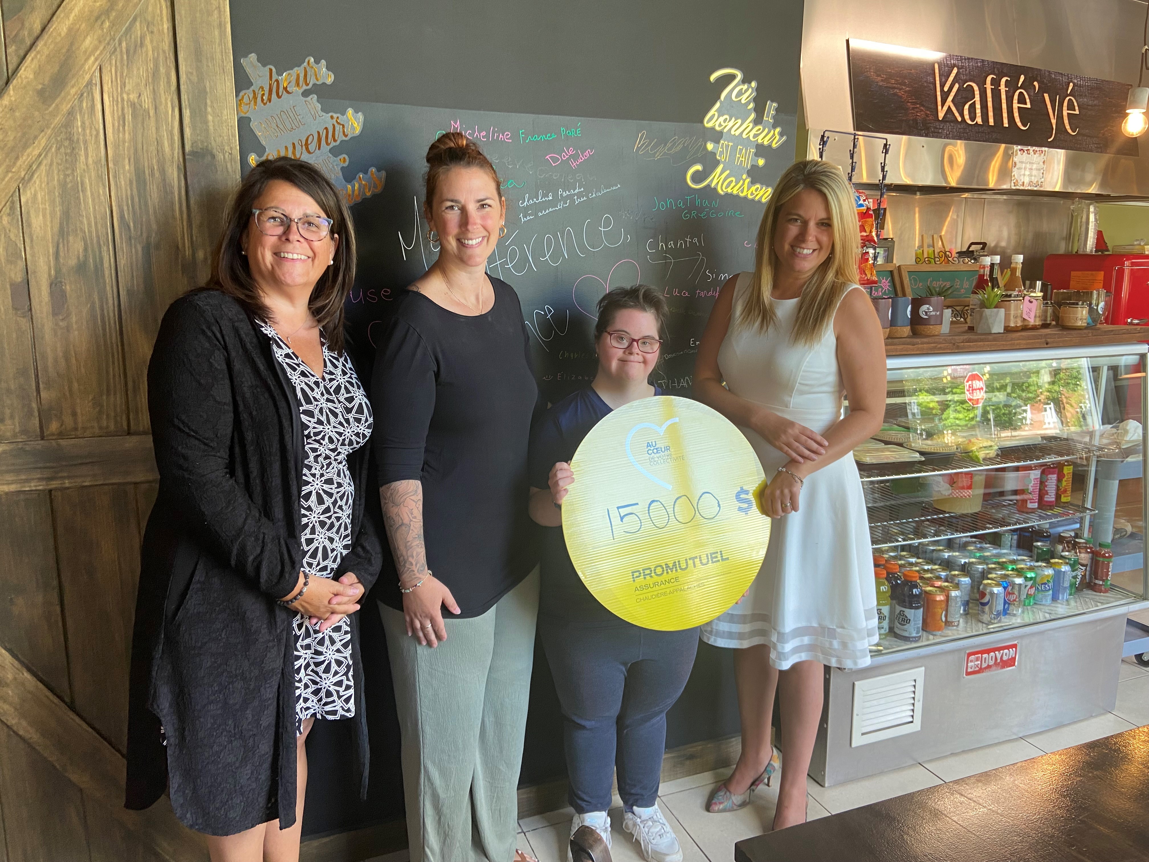 Left to right: Anne Vaillancourt, General Manager, Promutuel Insurance Chaudière-Appalaches; Jessika Lacombe, Director, Association Renaissance des Appalaches; Élisabeth Grenier, proud Kaffé’yé collaborator; Sophie Dion, 2nd Vice-Chair, Promutuel Insurance Chaudière-Appalaches.