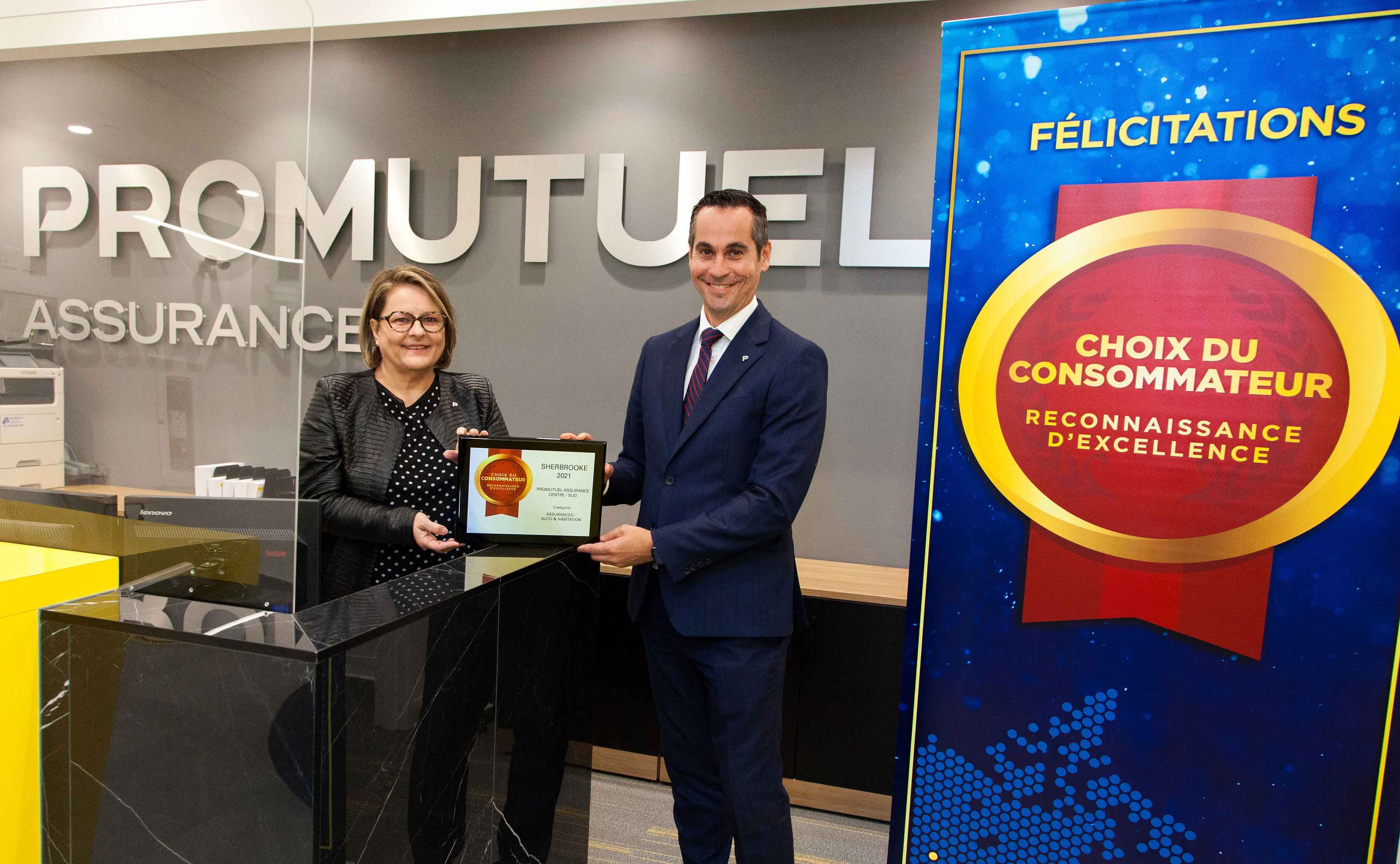 Photo, left to right: Guylaine Romanesky, General Manager of Promutuel Insurance Centre-Sud, and André Gagnon, Director of Personal Insurance Operations, received the 2021 Consumer Choice Award for Sherbrooke in the Insurance – Home and Auto category at our head office in Sherbrooke.