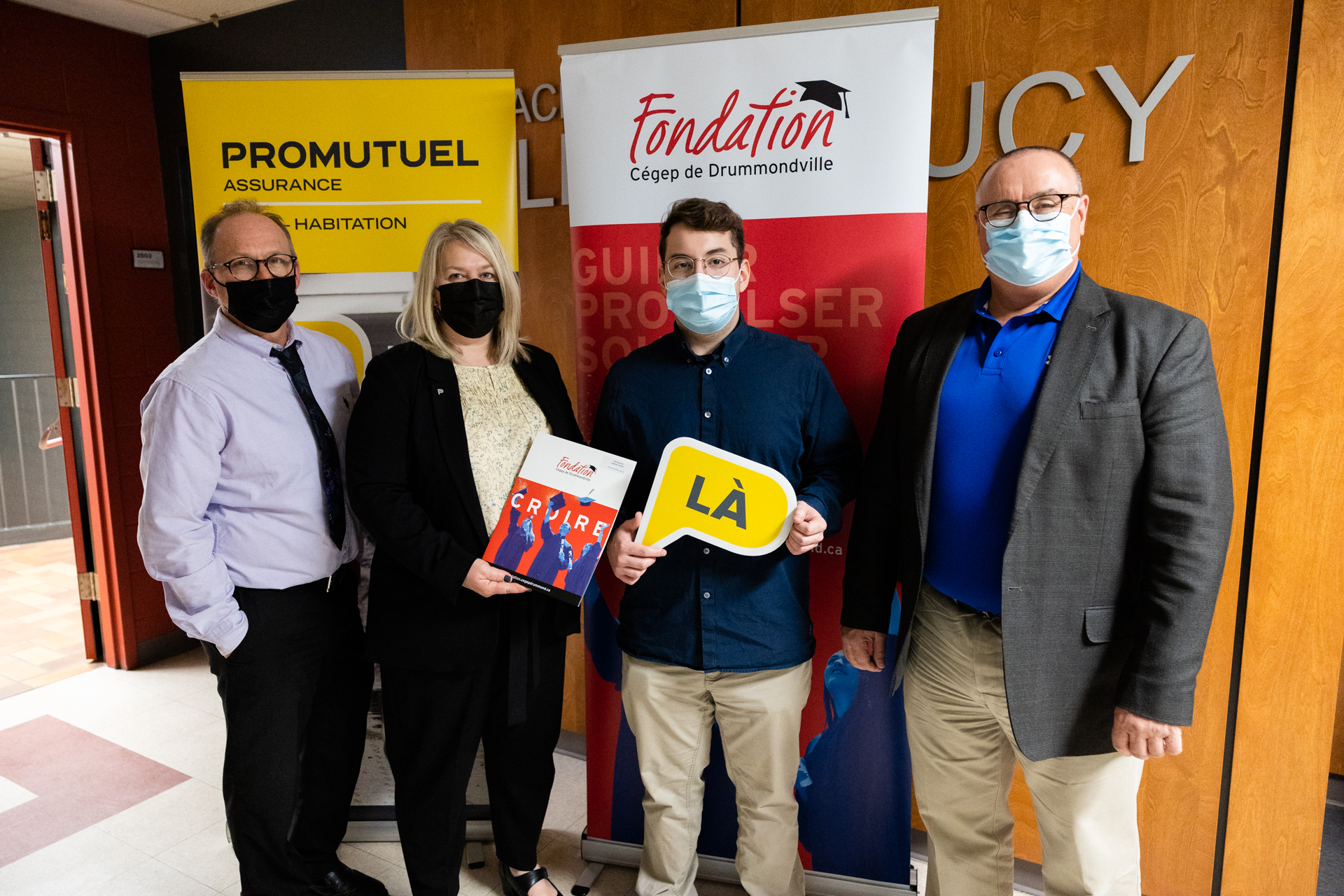 Sur la photo, de gauche à droite : M. Mario Carrier, directeur des études au Cégep de Drummondville, notre collèque Lyne Préseau, conseillère en ressources humaines chez Promutuel Assurance Centre-Sud, Raphaël Hamel, étudiant en Techniques de services financiers et d’assurances et futur stagiaire dans notre équipe, ainsi que M. Pierre Vigeant, directeur de la Fondation du Cégep de Drummondville.
