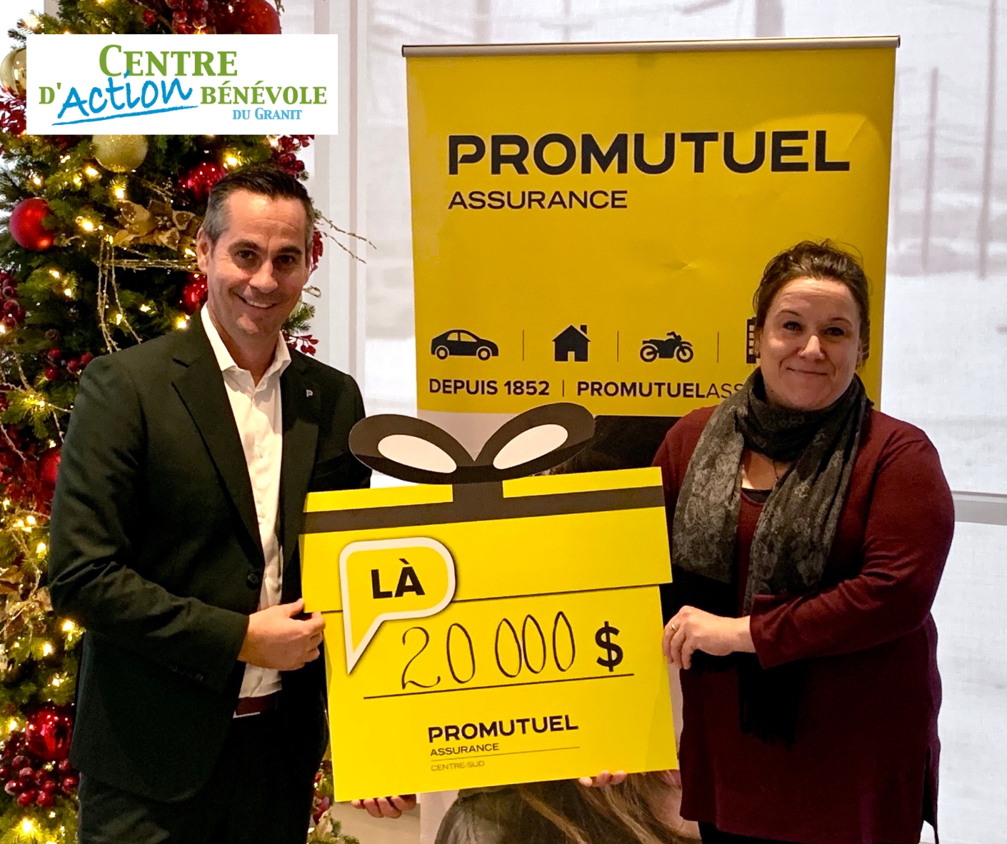 M. André Gagnon, directeur des opérations chez Promutuel Assurance Centre-Sud et Mme Vicky Ménard, directrice générale du Centre d’action bénévole du Granit.