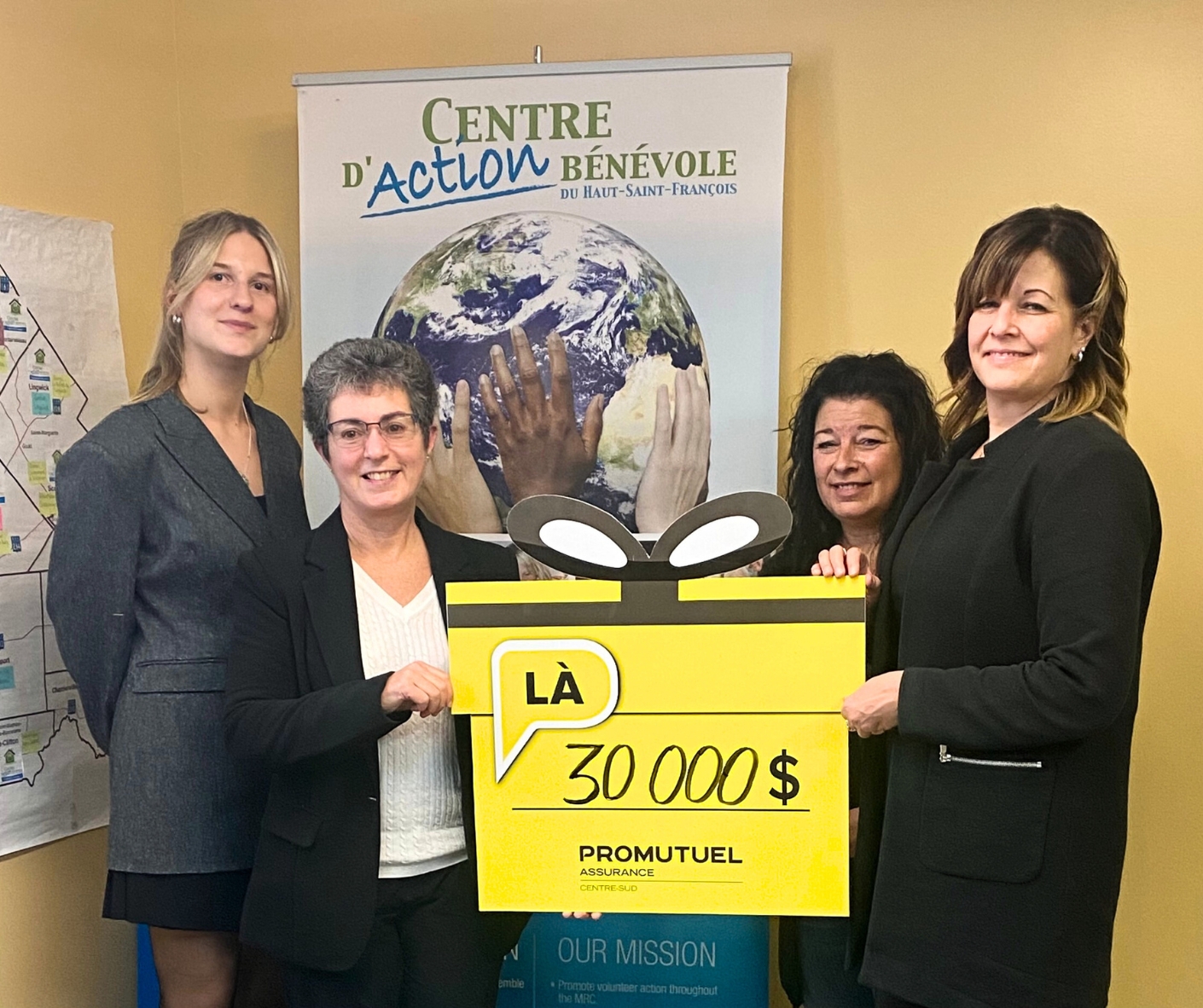 Mme Angela Sukic, conseillère en communication et marketing chez Promutuel Assurance Centre-Sud, Mme France Lebrun, directrice générale au Centre d’action bénévole du Haut-Saint-François, Mme Nancy Blanchette, coordinatrice de programmes communautaires et Mme Valérie Bergeron, directrice des opérations en assurance des entreprises, agricole et courtage.