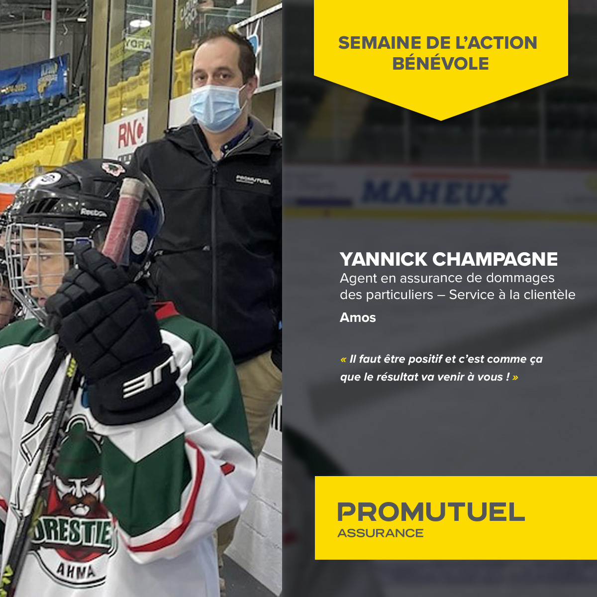 • Impliqué dans l’Association du hockey mineur d’Amos depuis déjà 9 ans, Yannick donne de son temps en tant qu’entraîneur pour l’équipe de hockey mineur les Forestiers M13 BB d’Amos